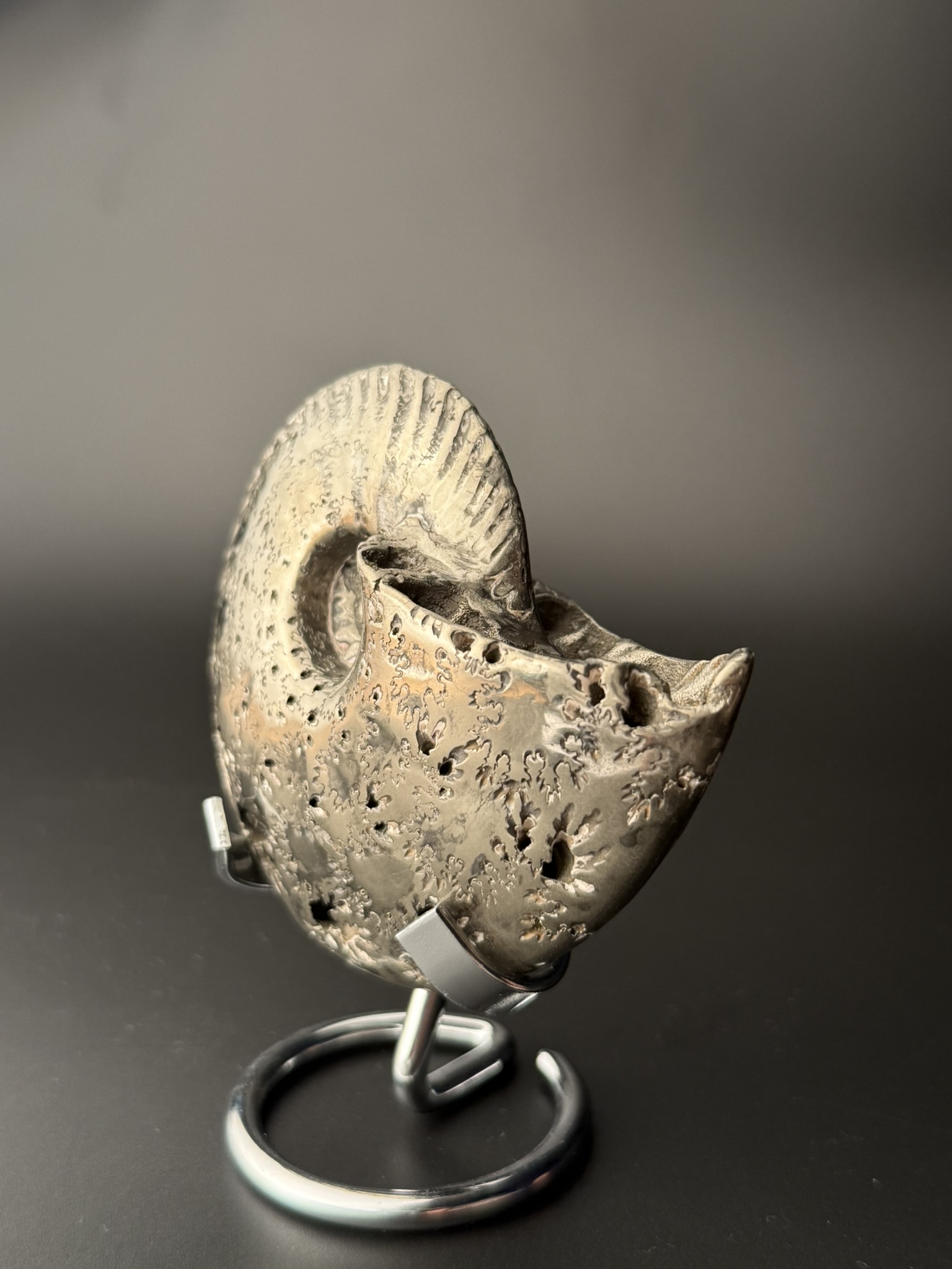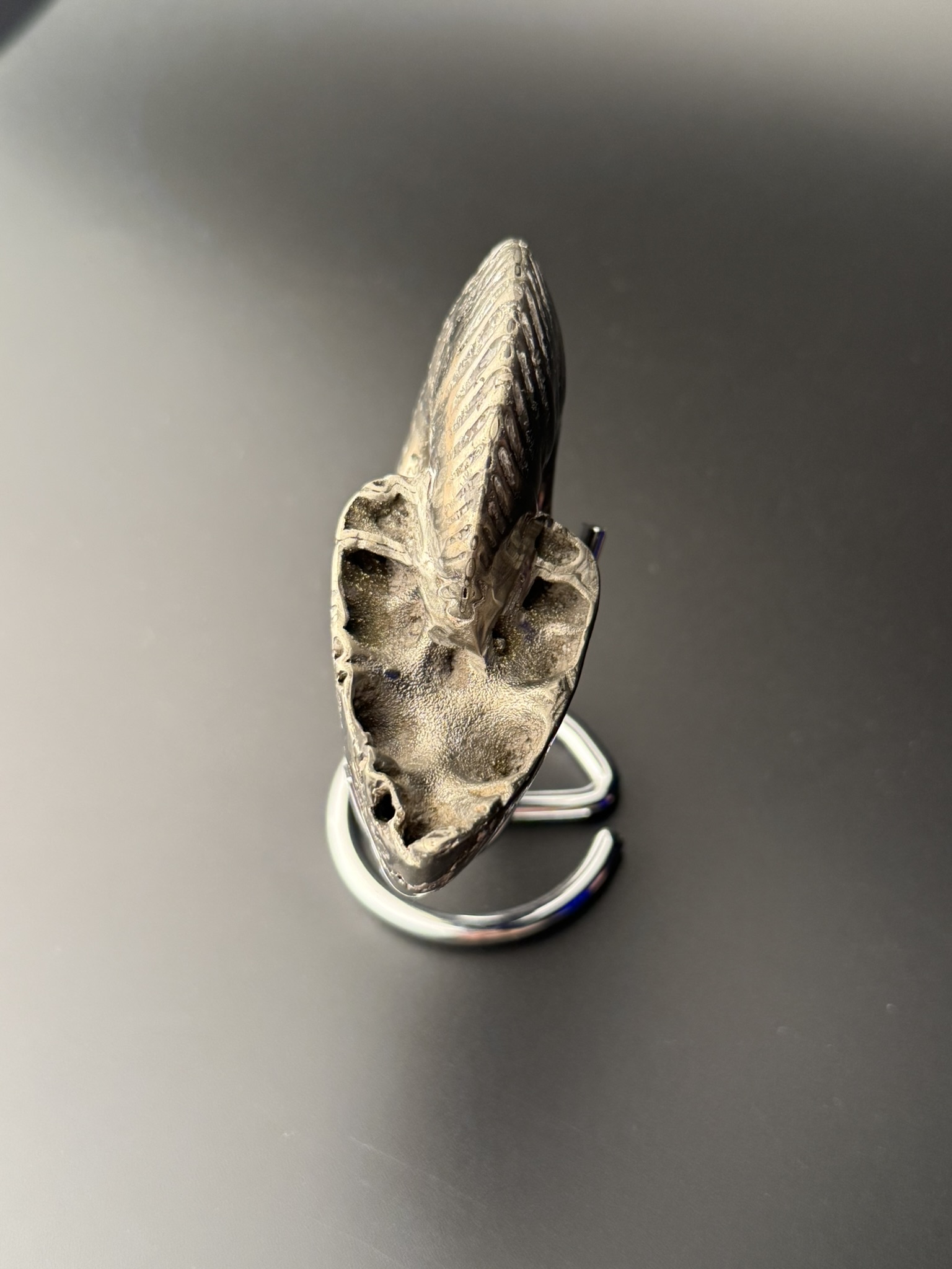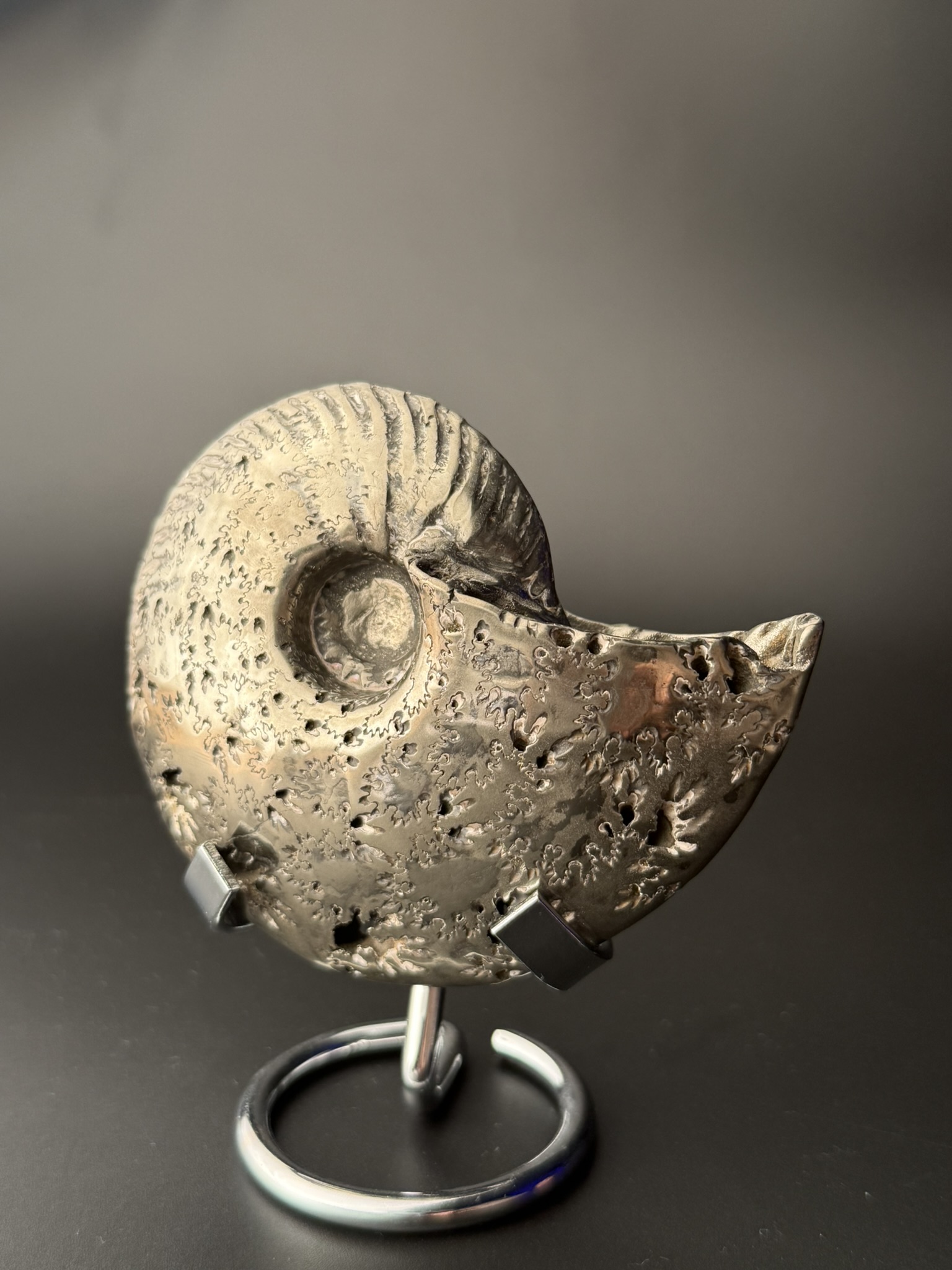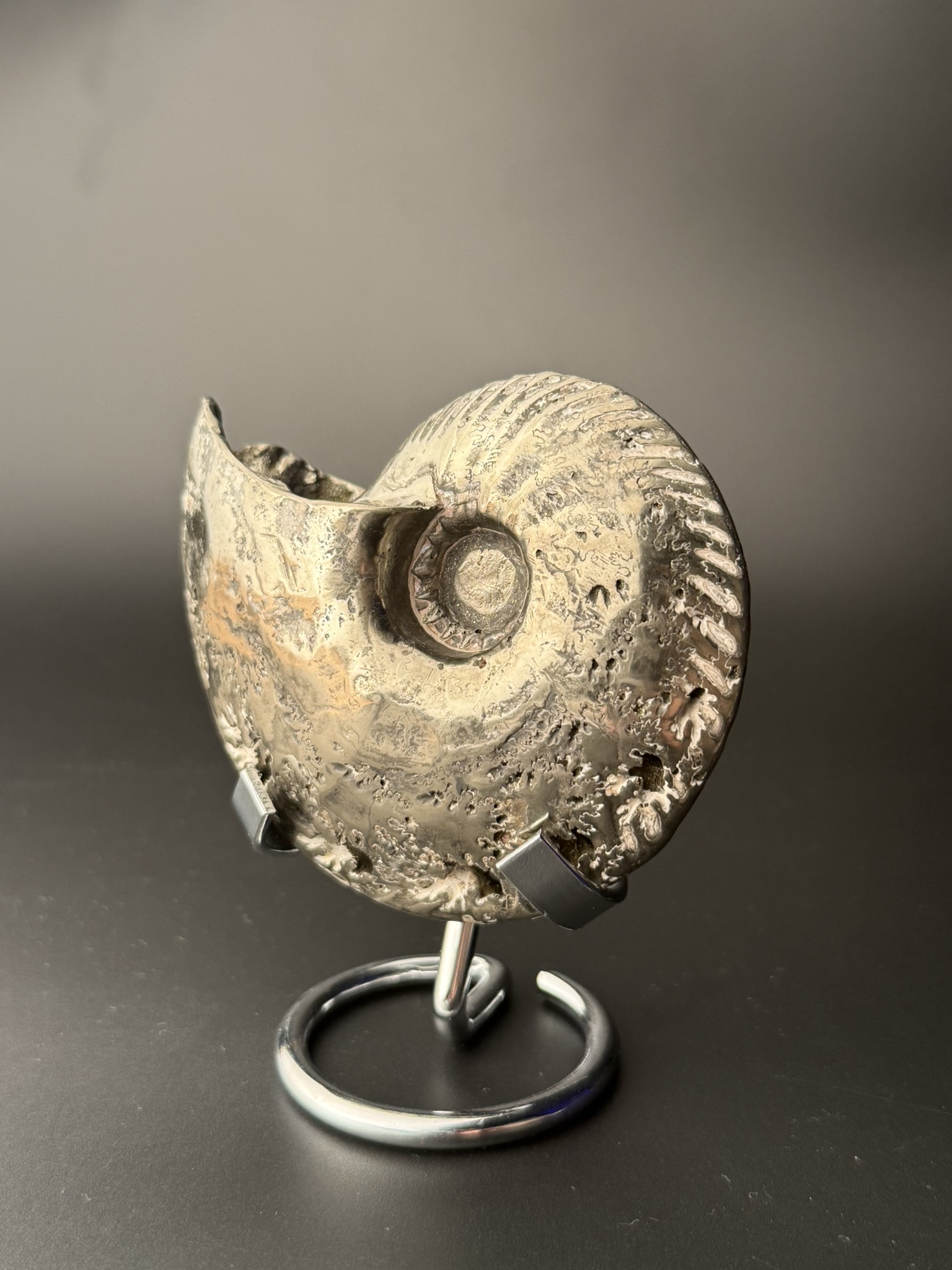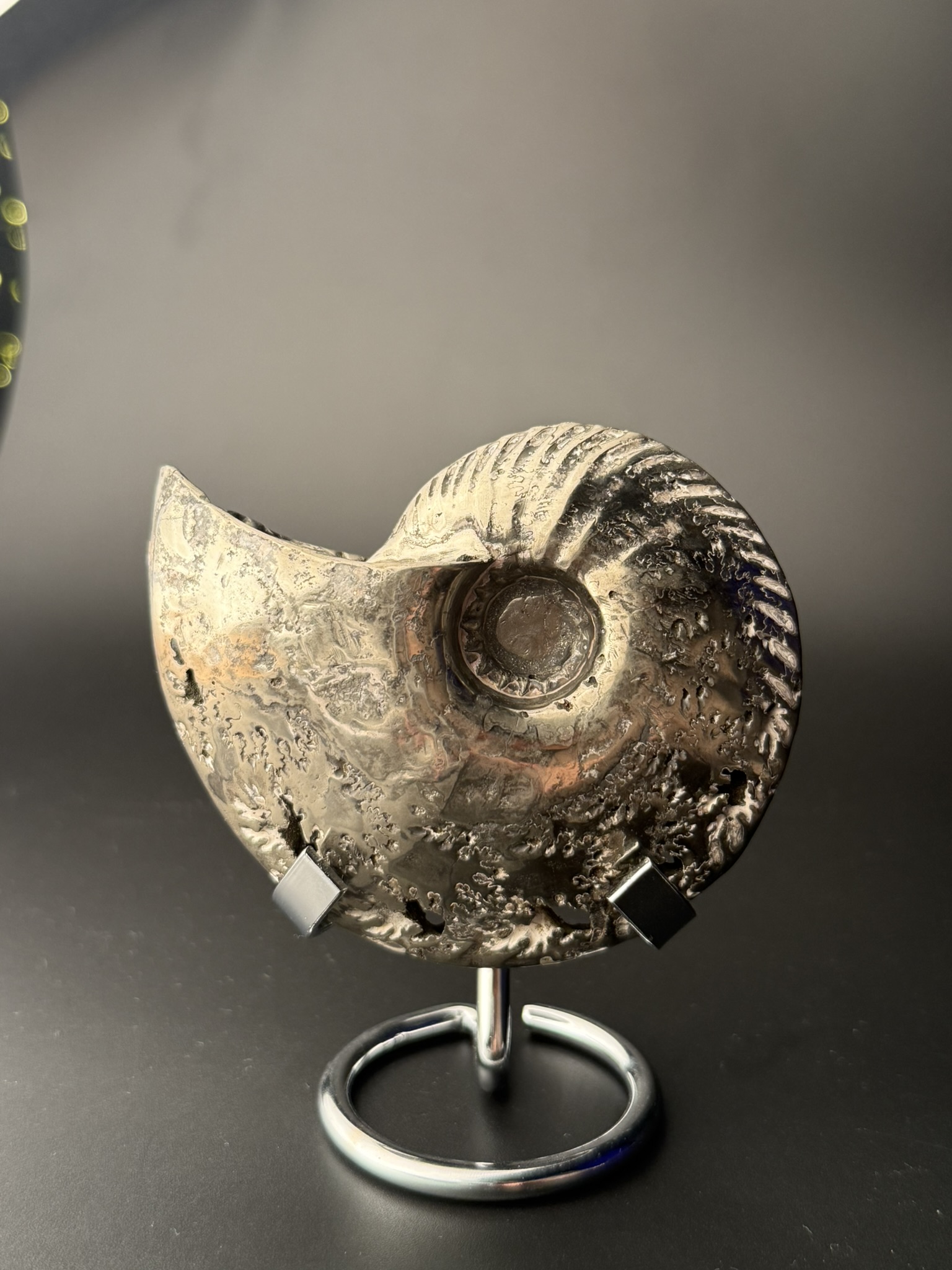 Аммонит Quenstedtoceras найден в Саратовской области, возраст 170 млн лет, Юра. Верхний слой пиритозамещенного аммонита отполирован.