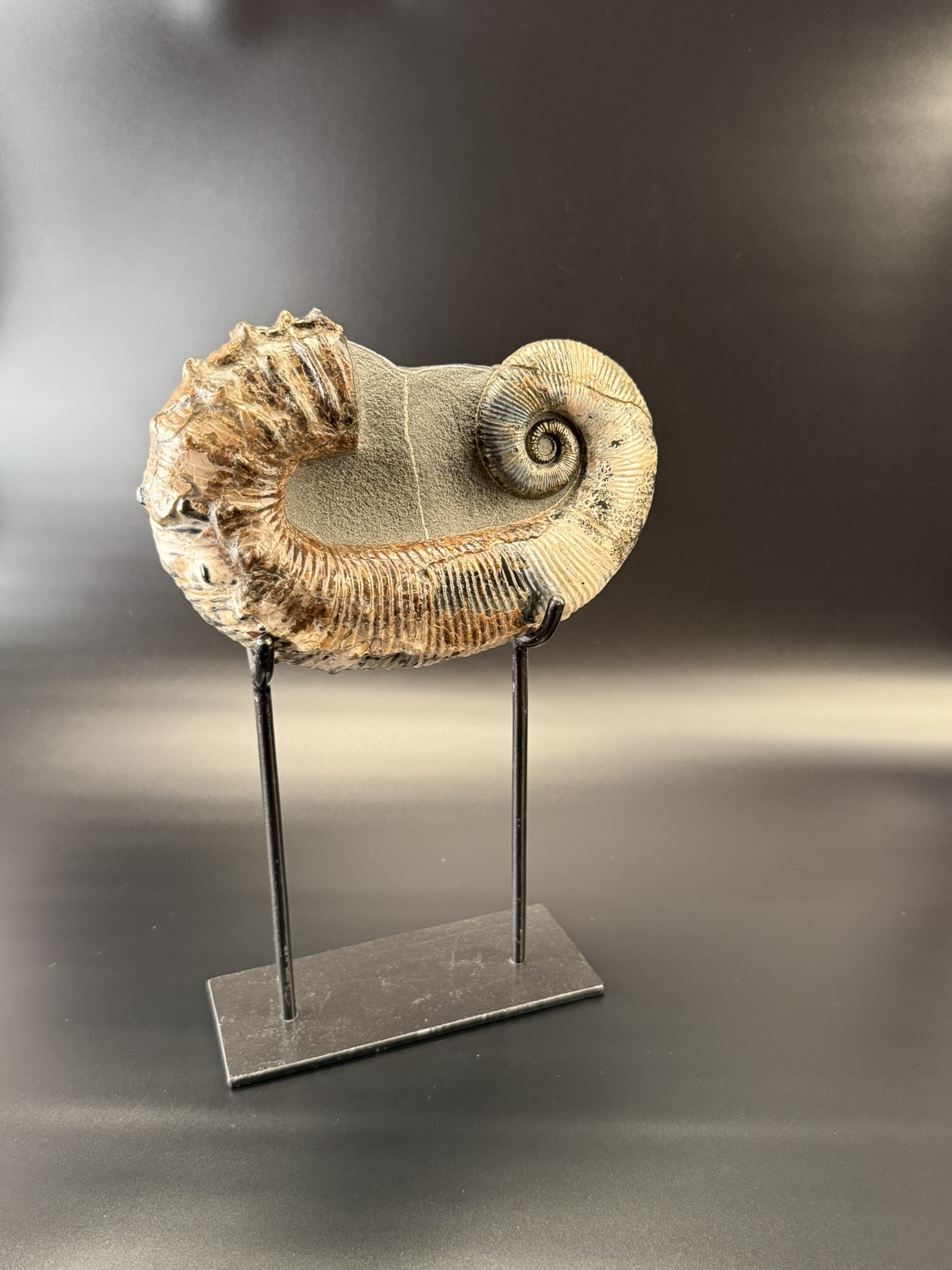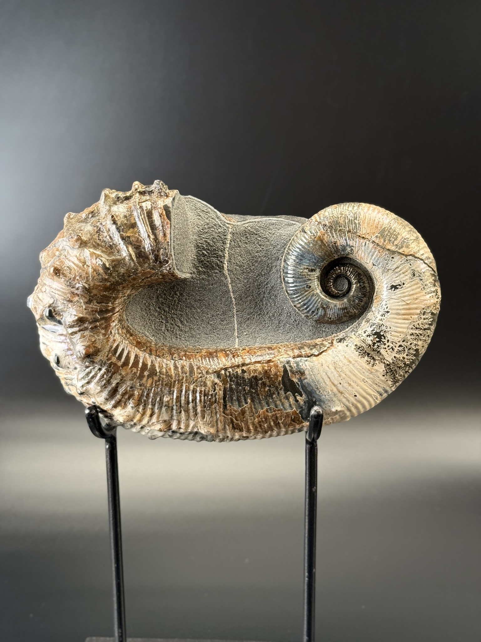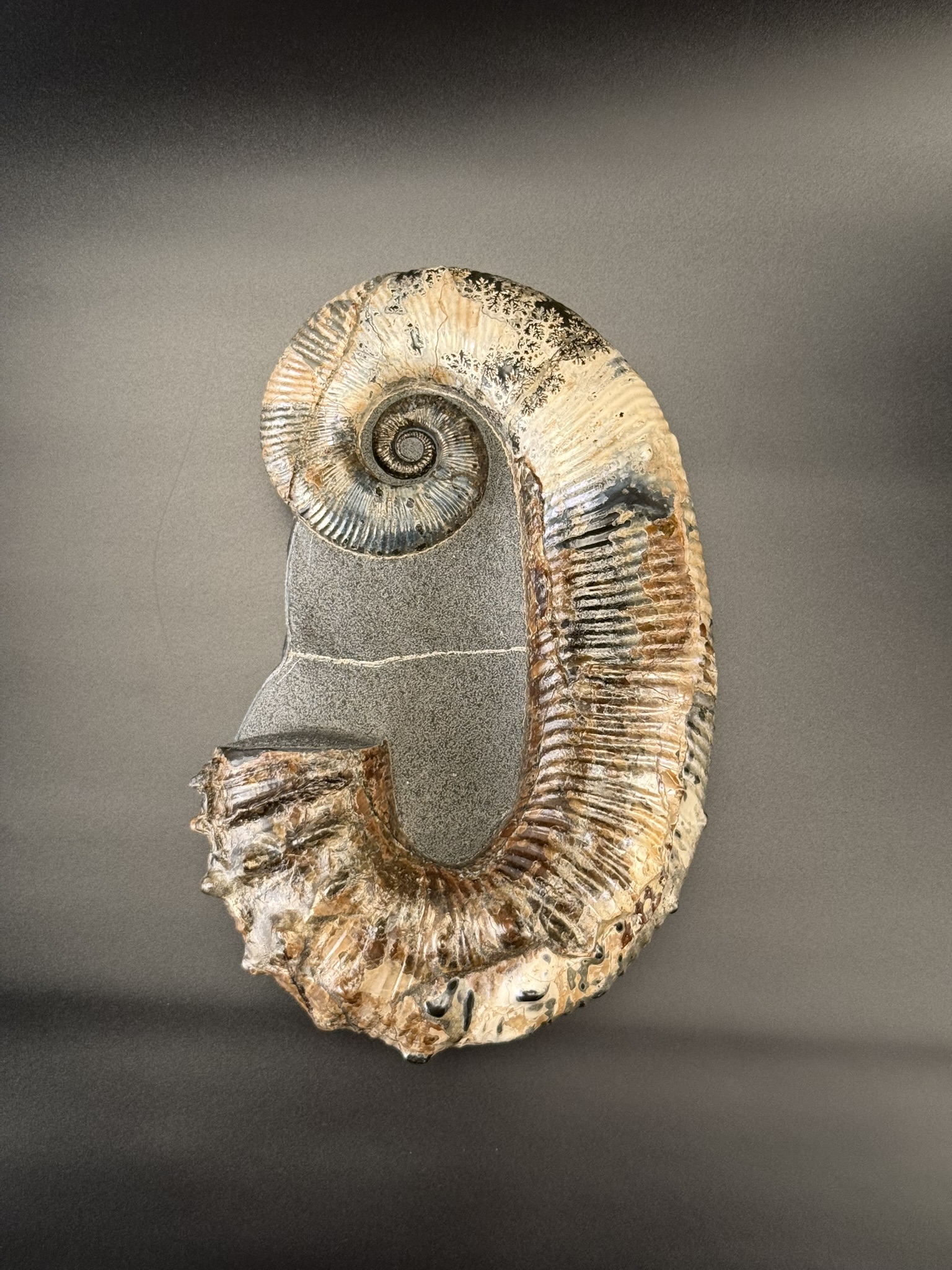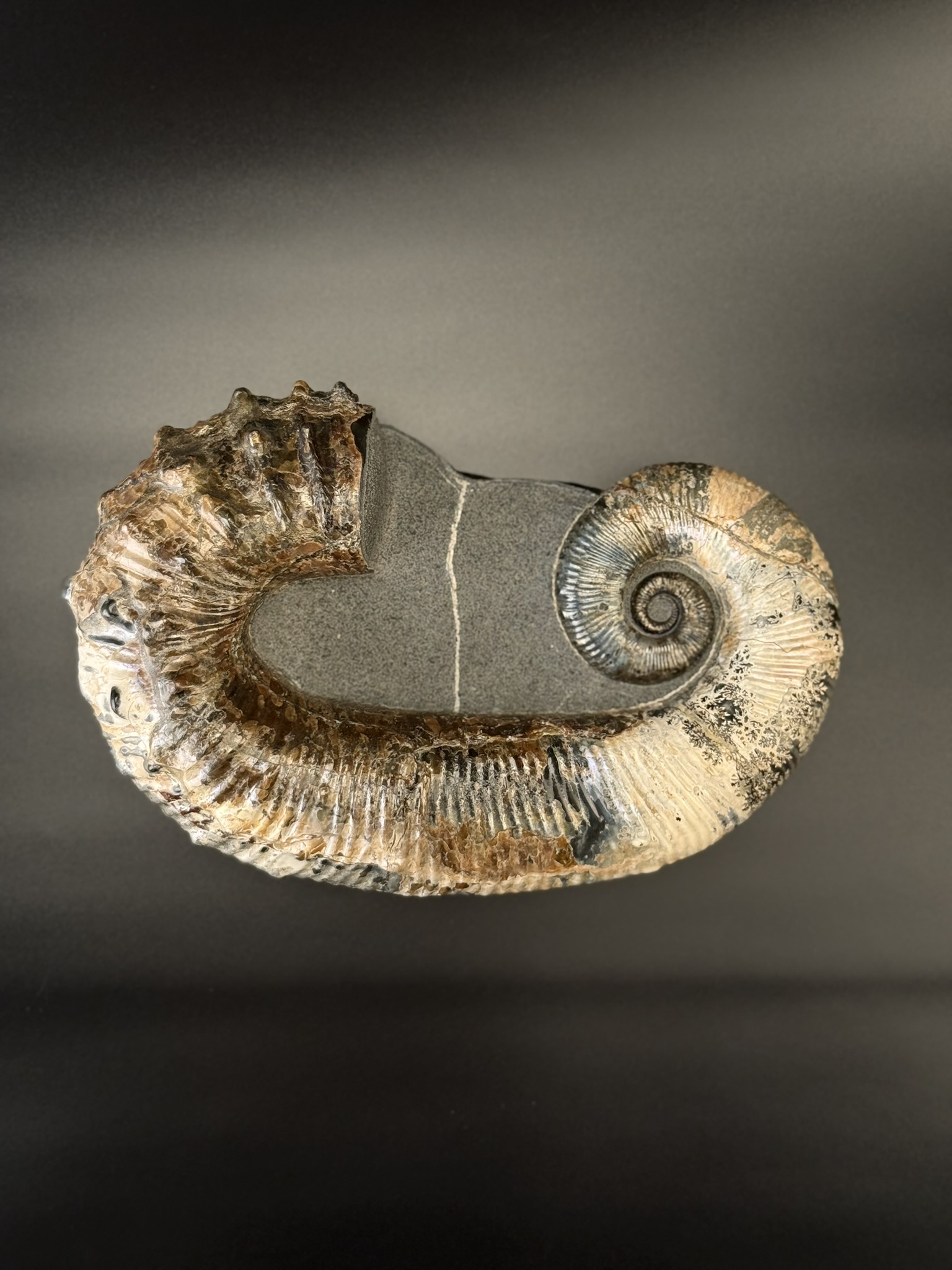 Развернутый аммонит Аудолицерас найден на территории Ульяновской области. Возраст находки 100 мл.лет. Раковина превосходной сохранности с сохранившимся перламутровым слоем.