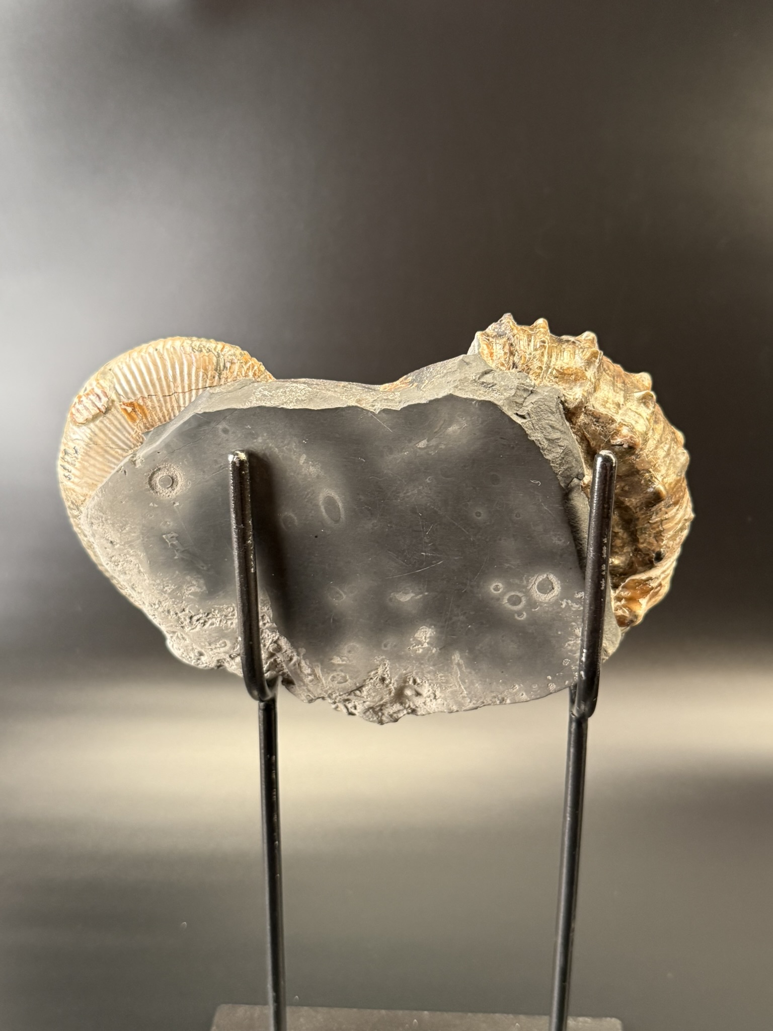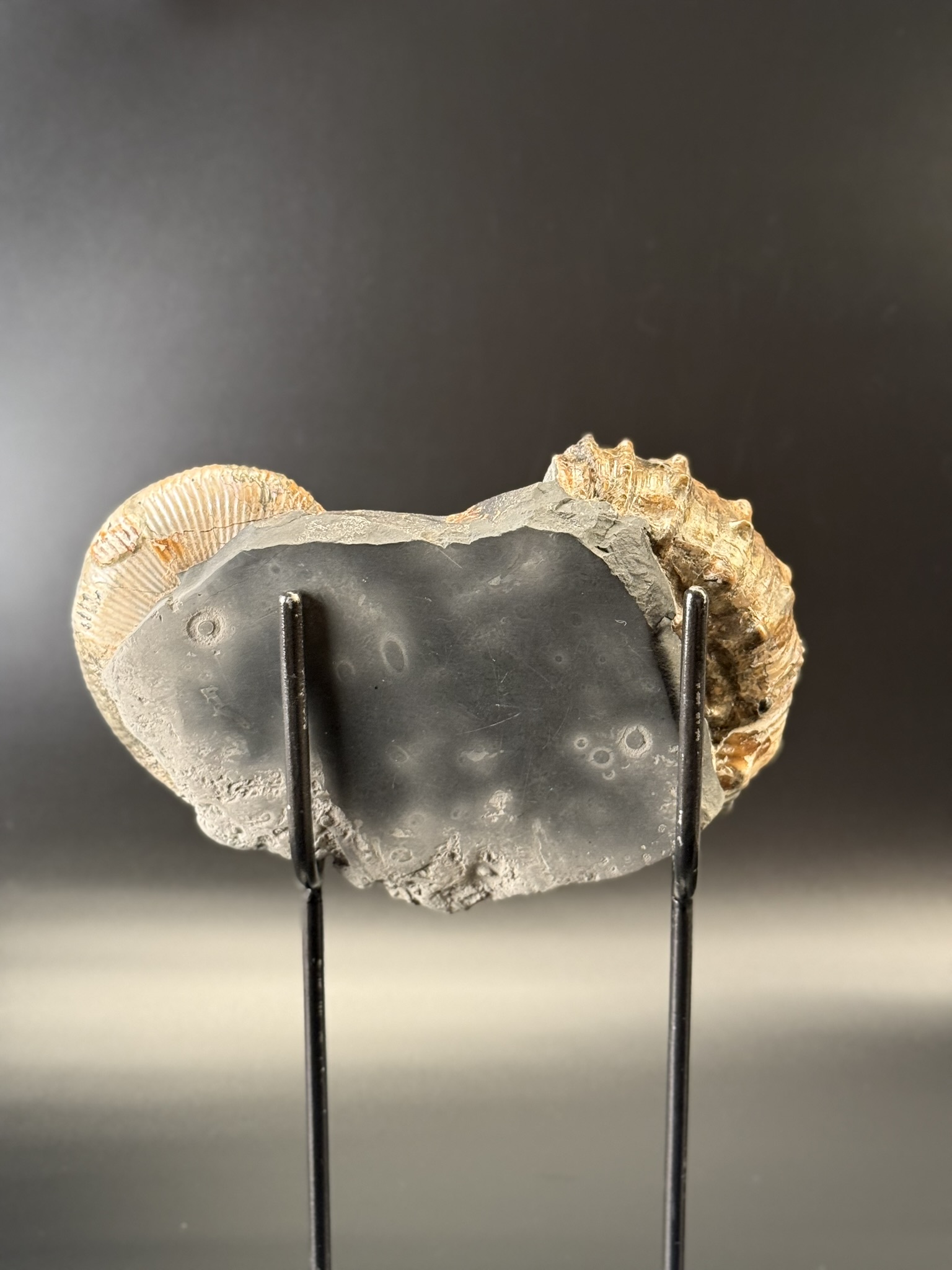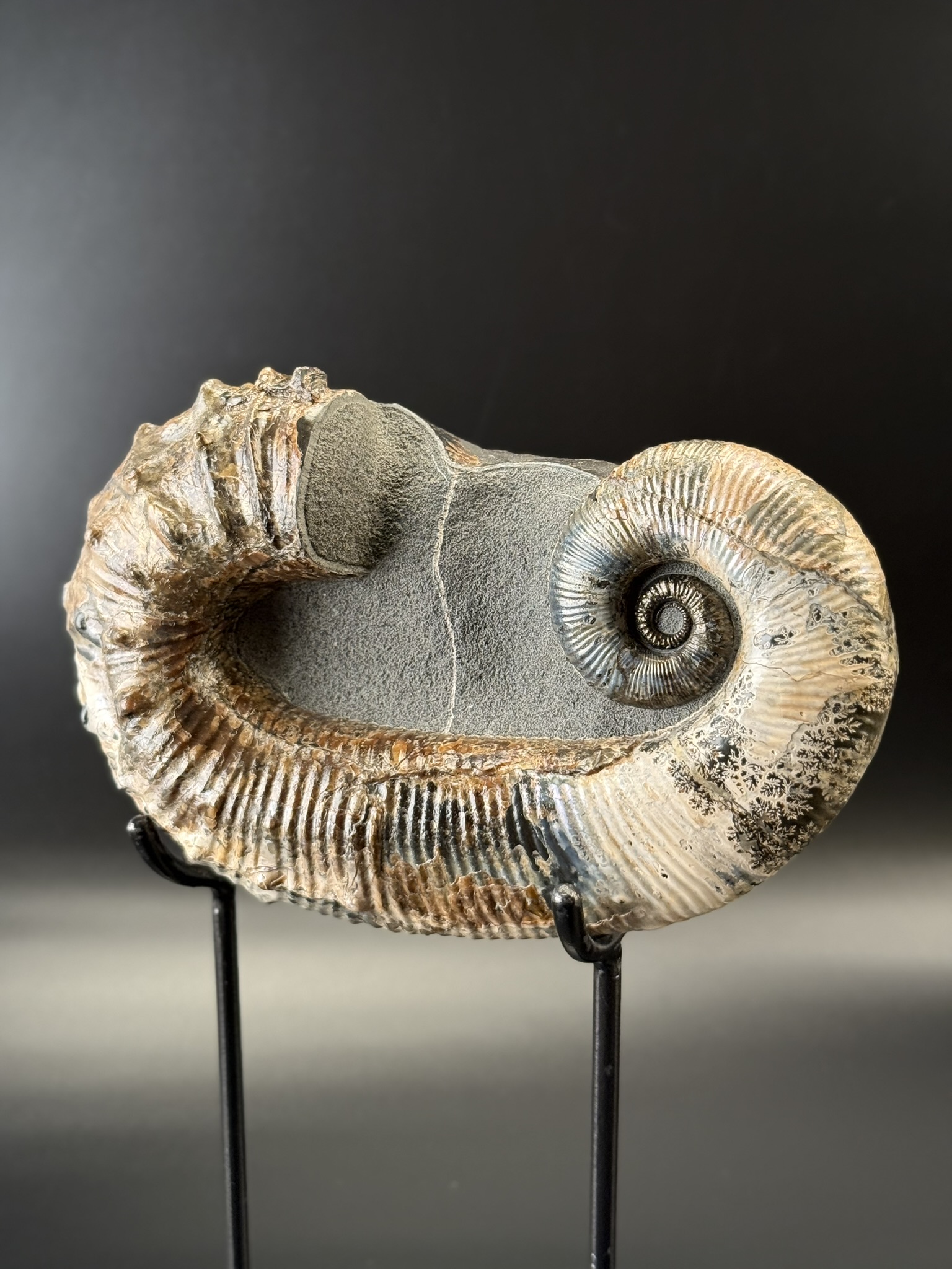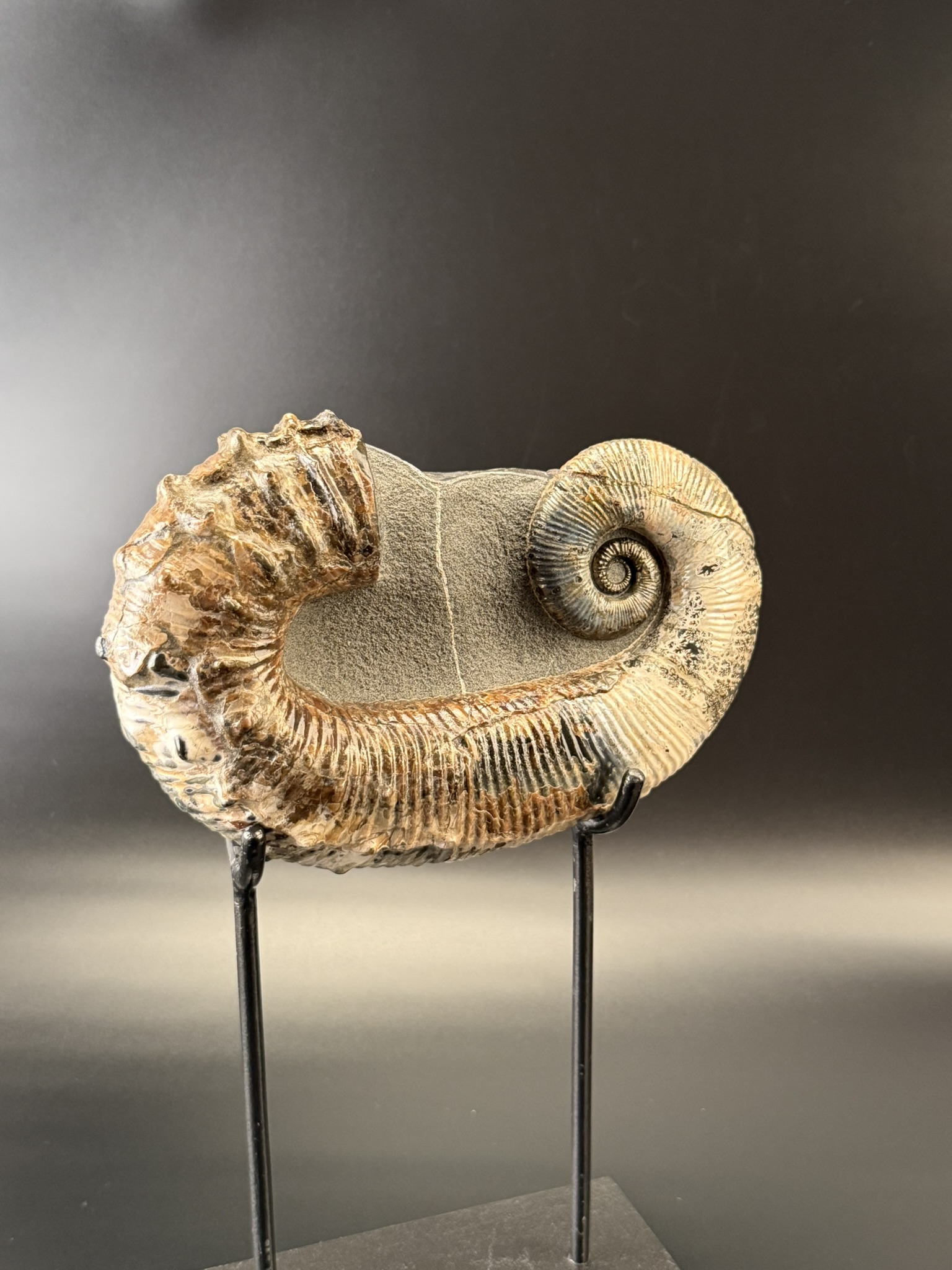 Развернутый аммонит Аудолицерас найден на территории Ульяновской области. Возраст находки 100 мл.лет. Раковина превосходной сохранности с сохранившимся перламутровым слоем.