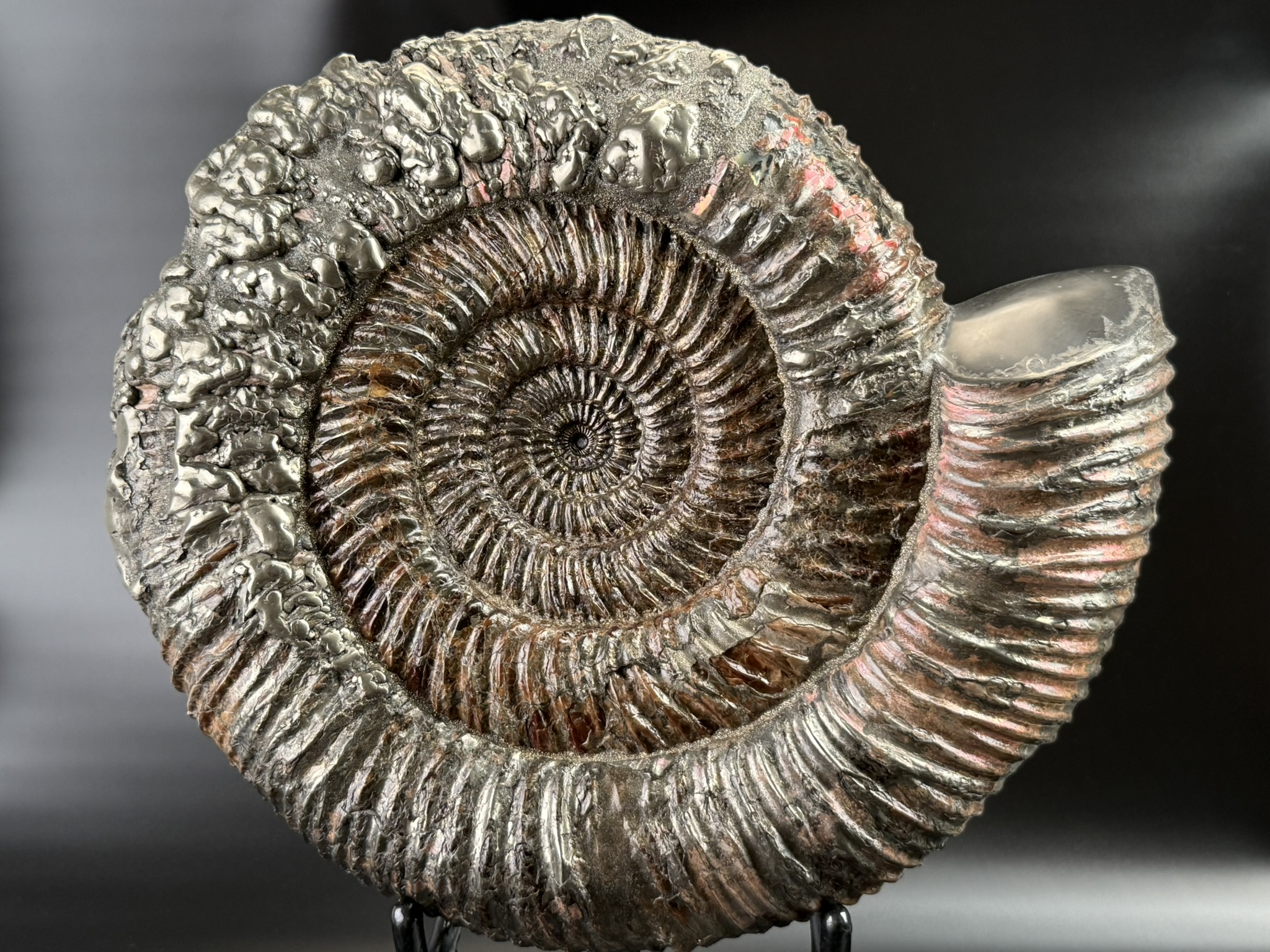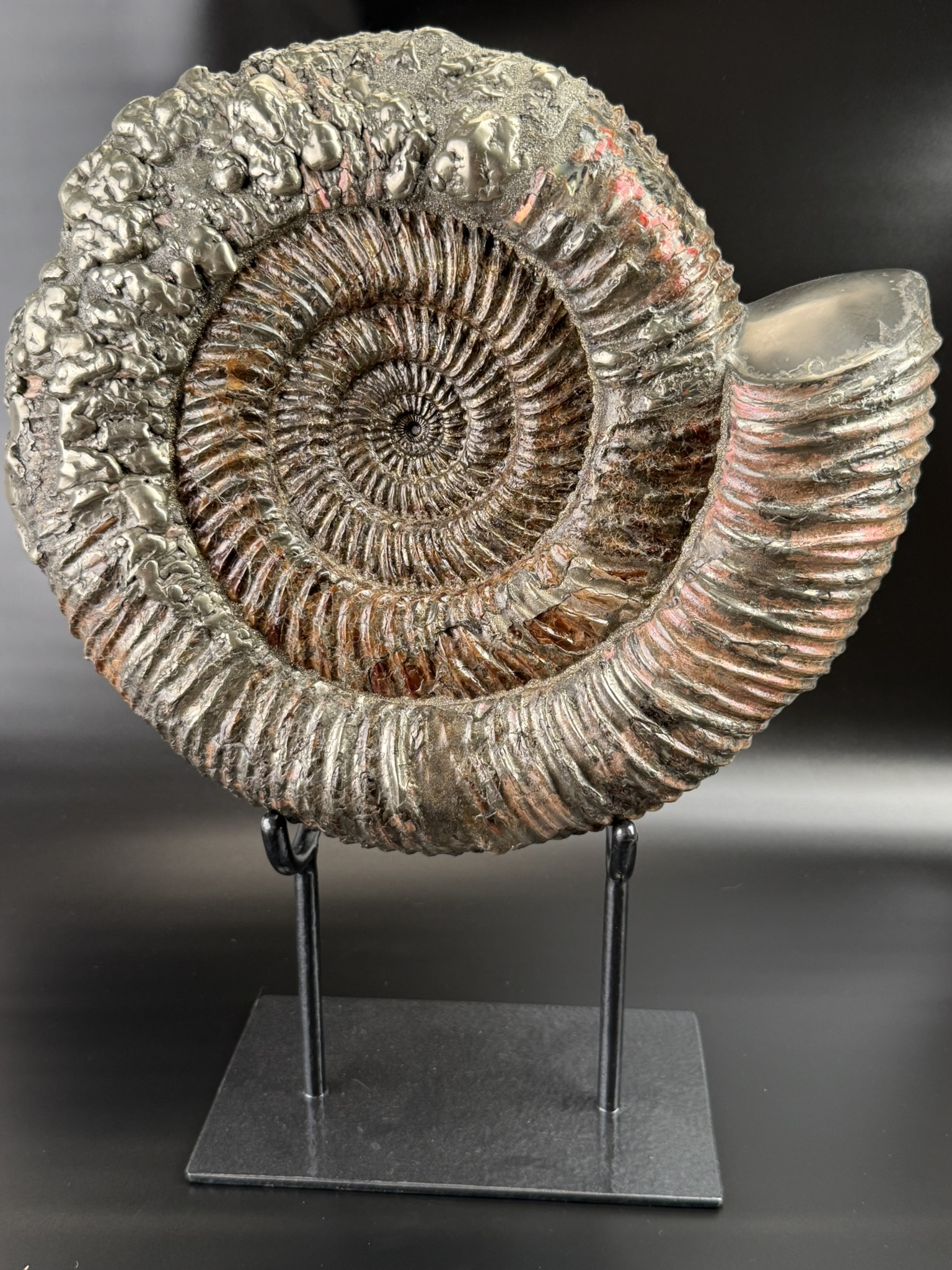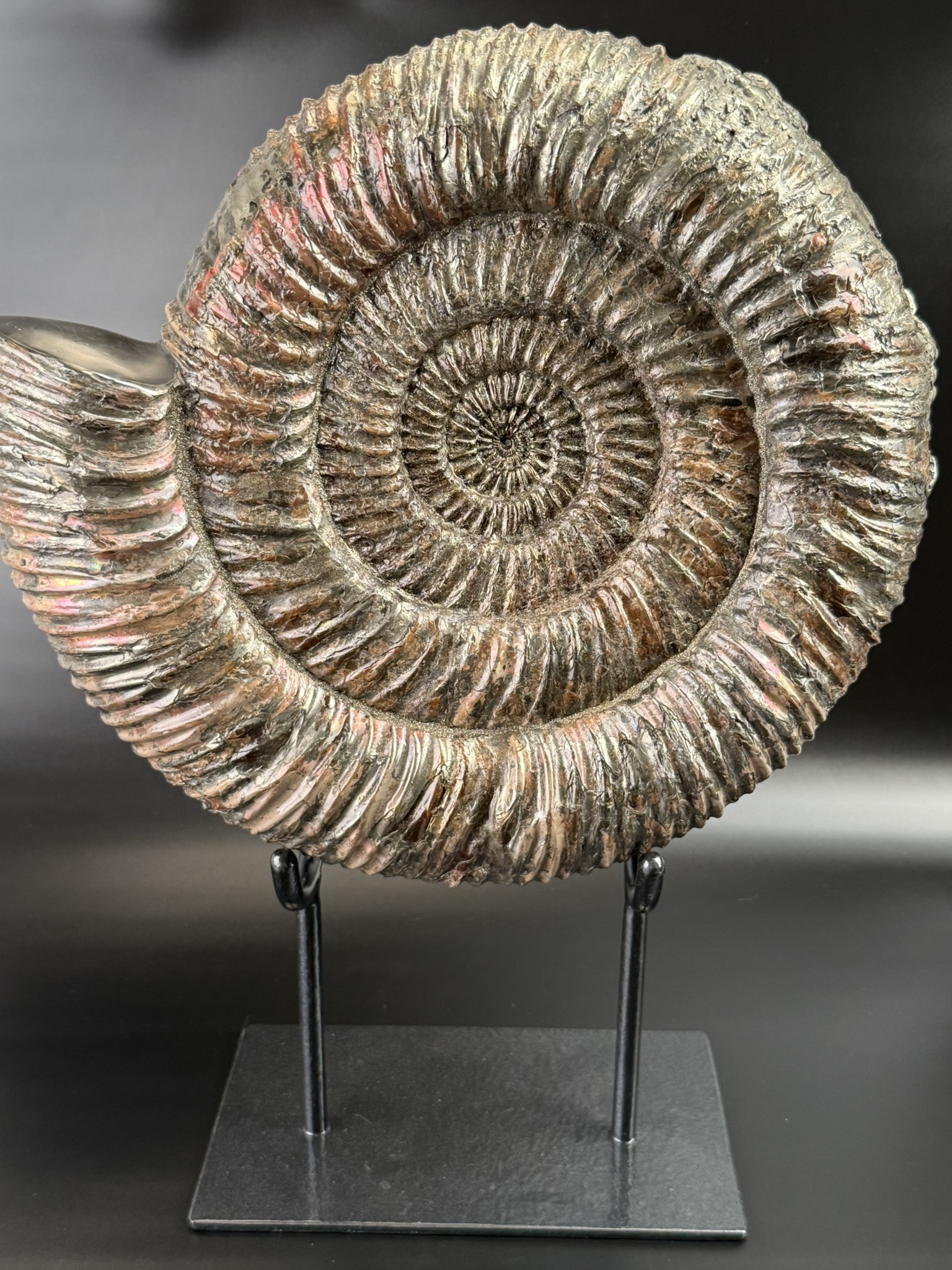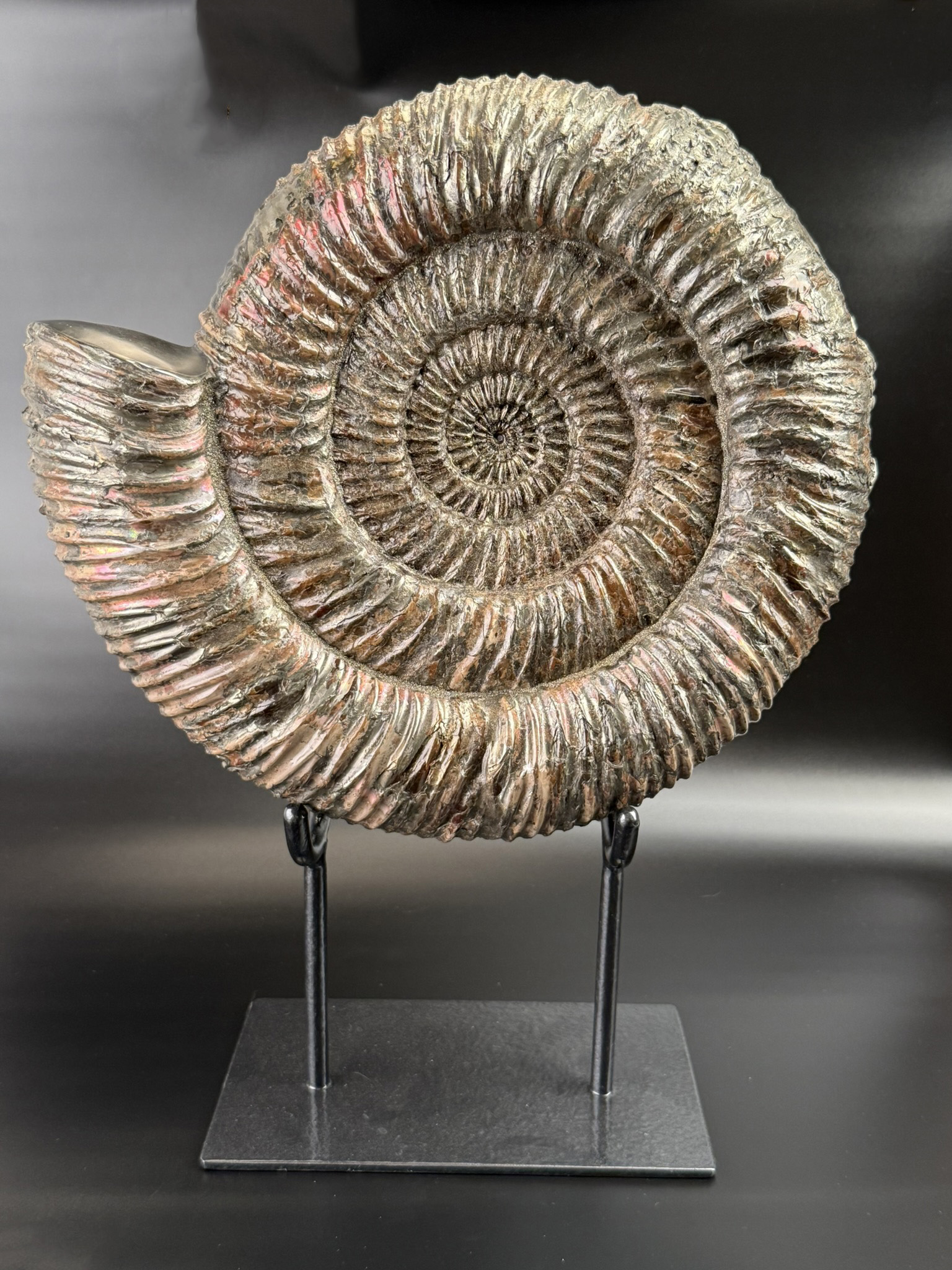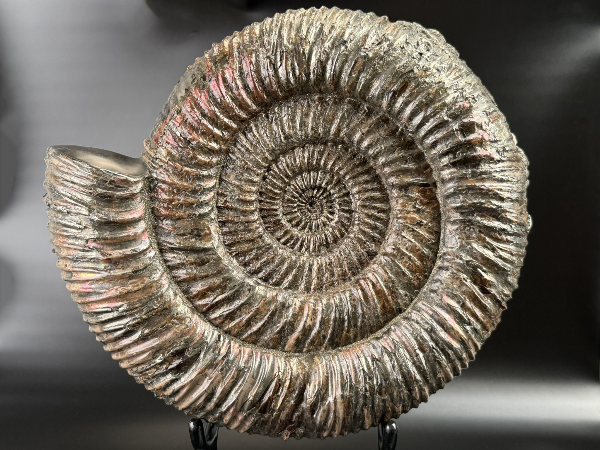 Большой аммонит Speetoniceras versicolor найден на территории Ульяновской области. Возраст 130 мл.лет по палеомагнитному анализу толщи. Подставка в комплект не входит. Перламутровый слой стабилизирован.