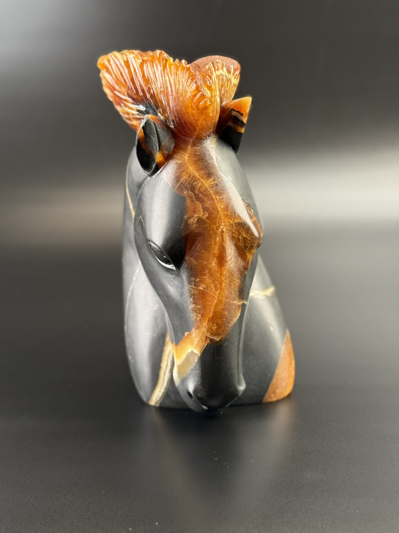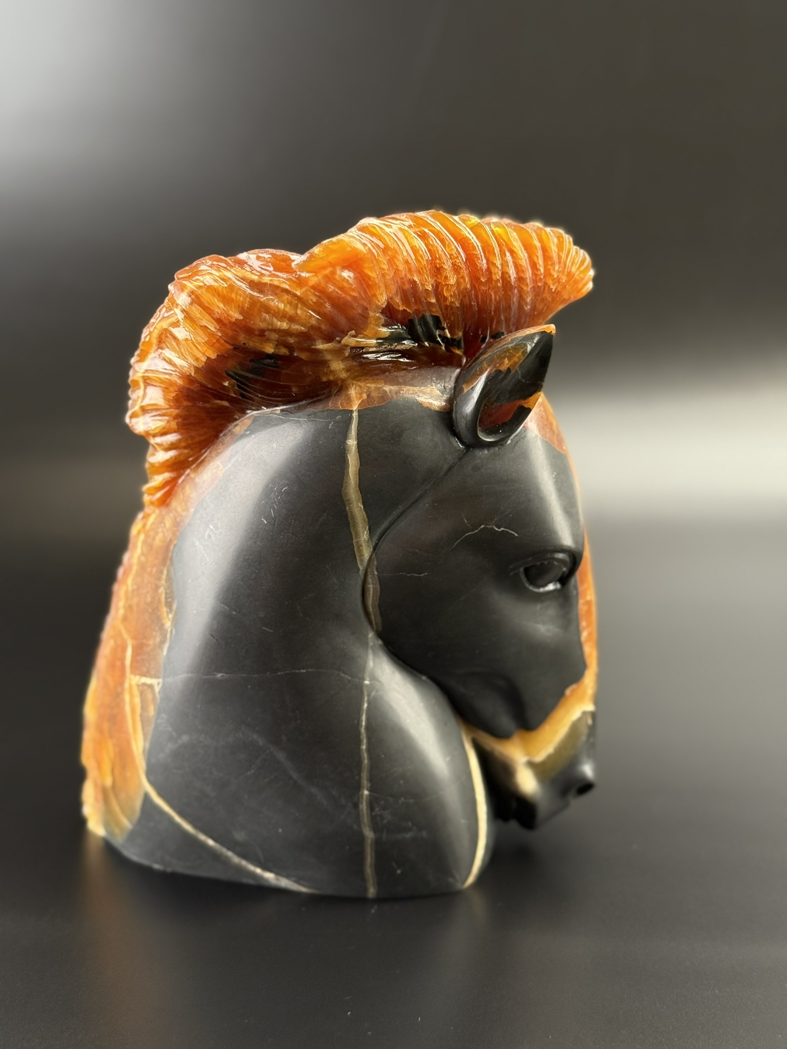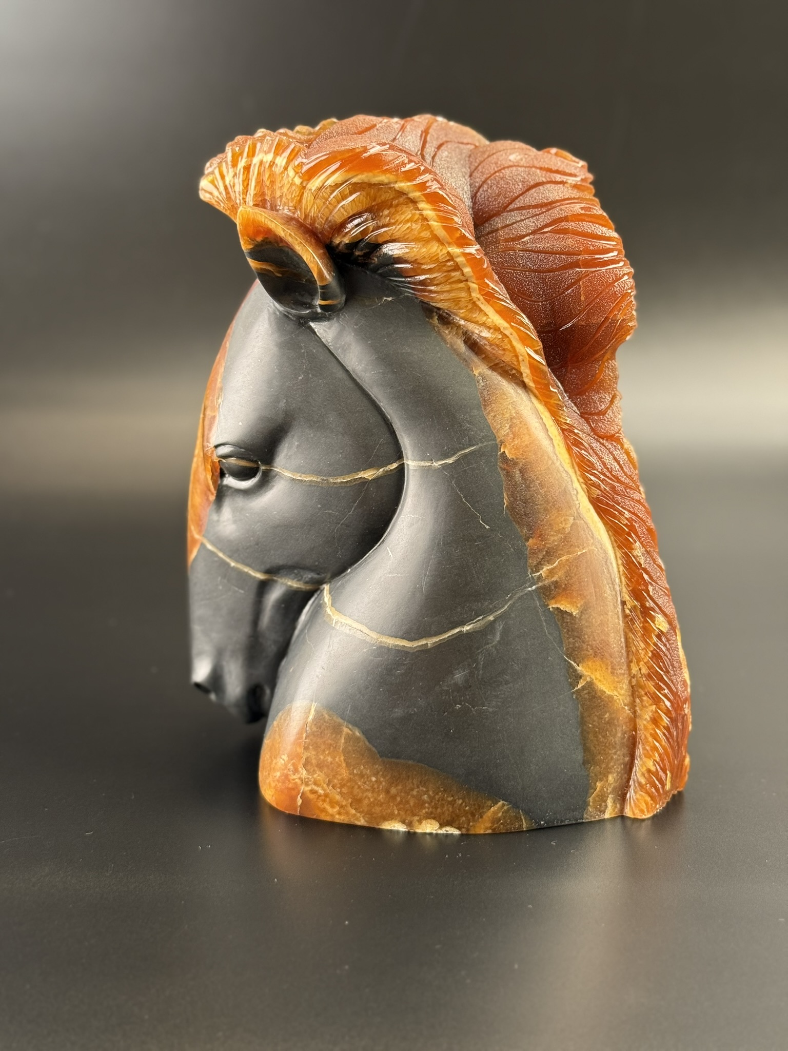 Резная скульптура коня, выполненная из жильного симбирцита, мастер сохранил природную фактуру кальцитовой щетки в элементах гривы. Авторская работа.