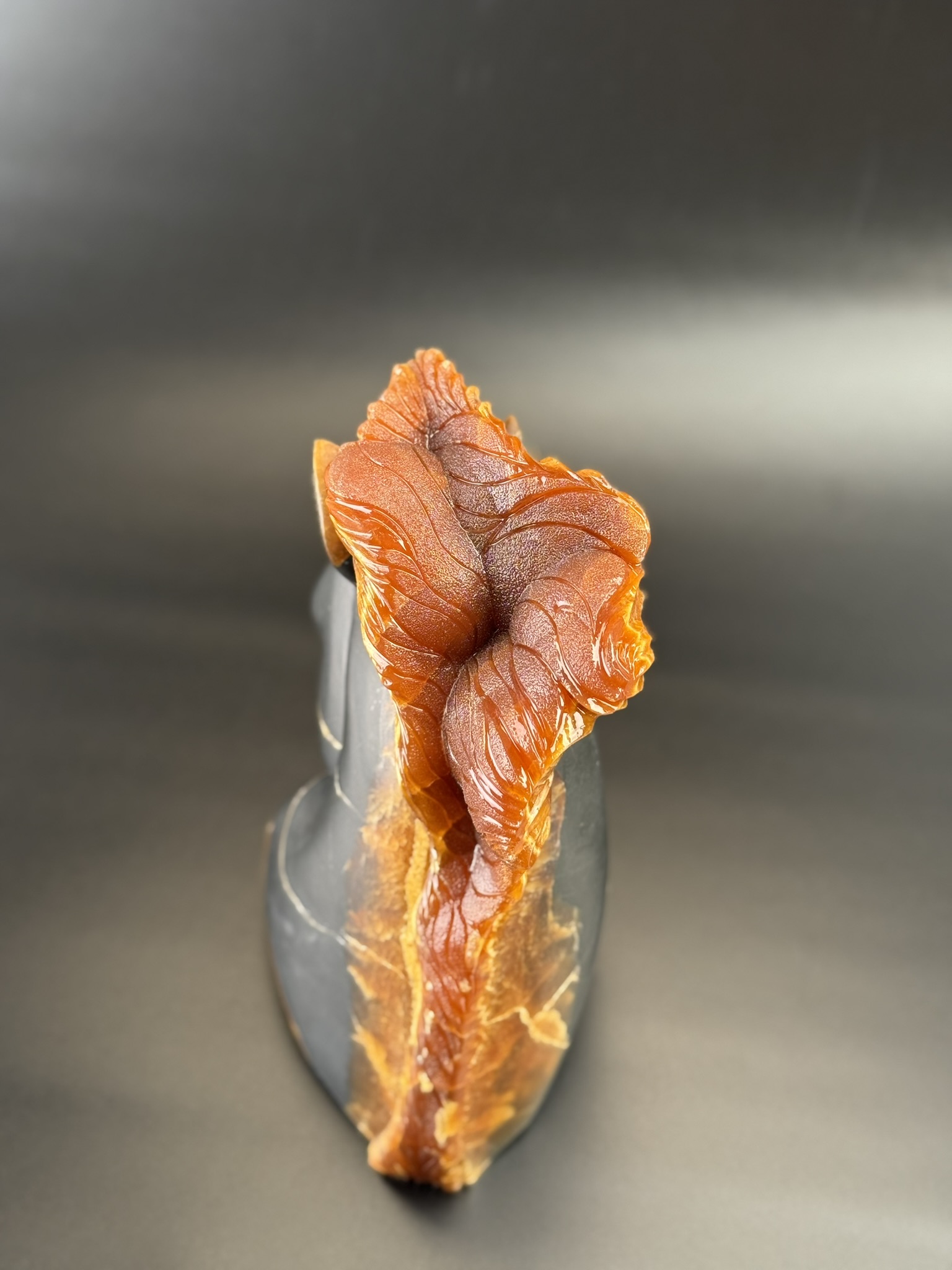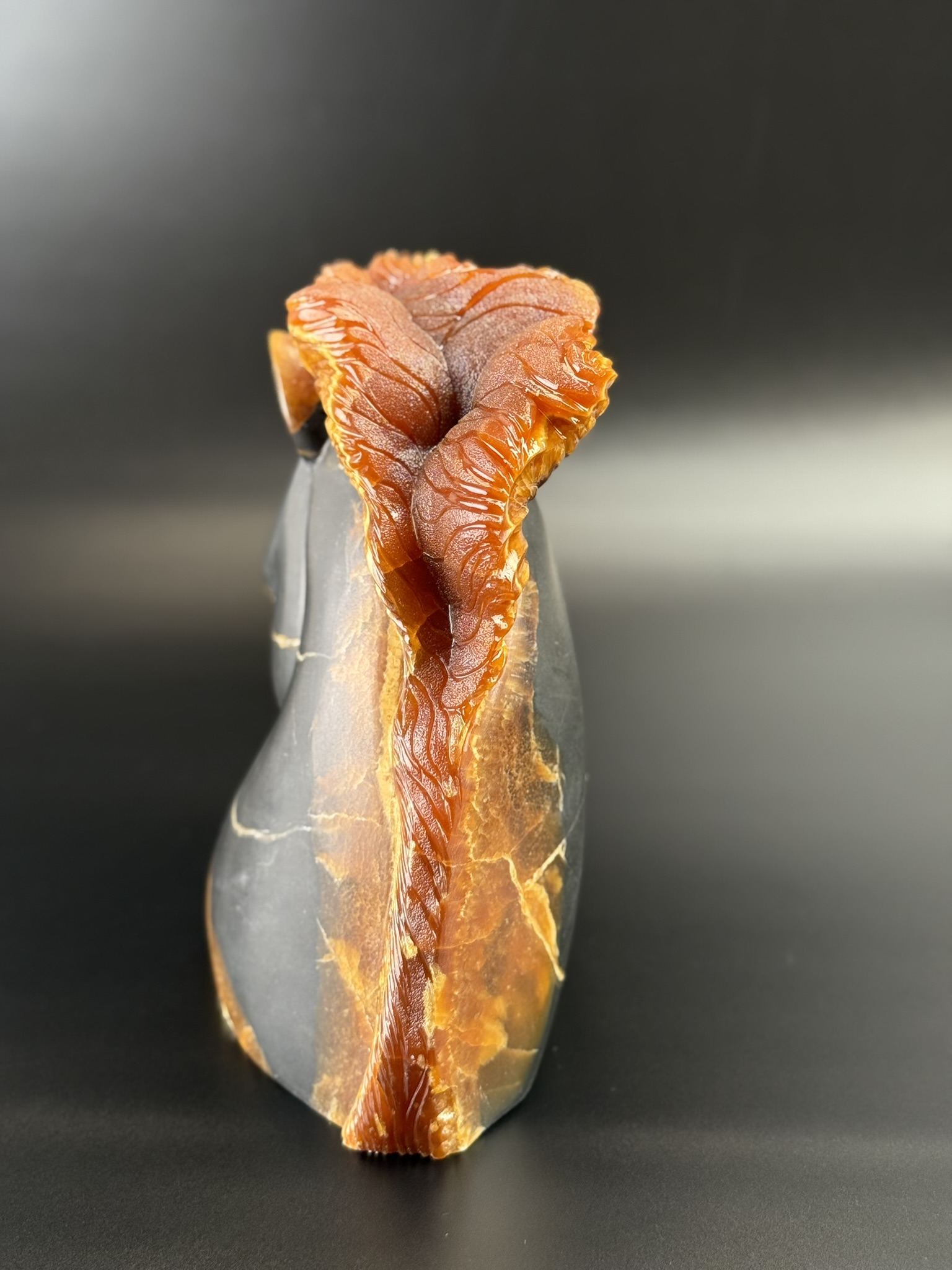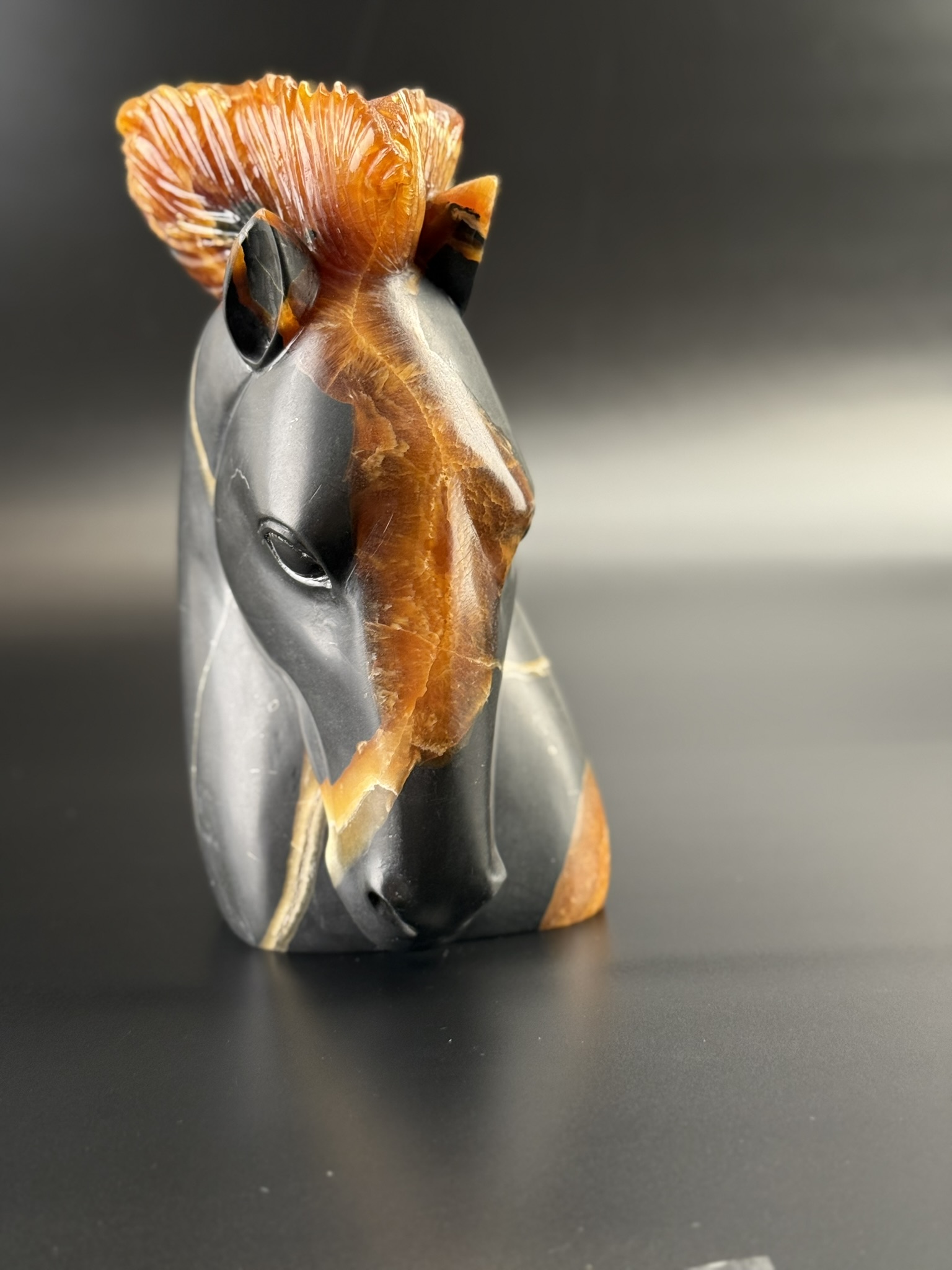 Резная скульптура коня, выполненная из жильного симбирцита, мастер сохранил природную фактуру кальцитовой щетки в элементах гривы. Авторская работа.