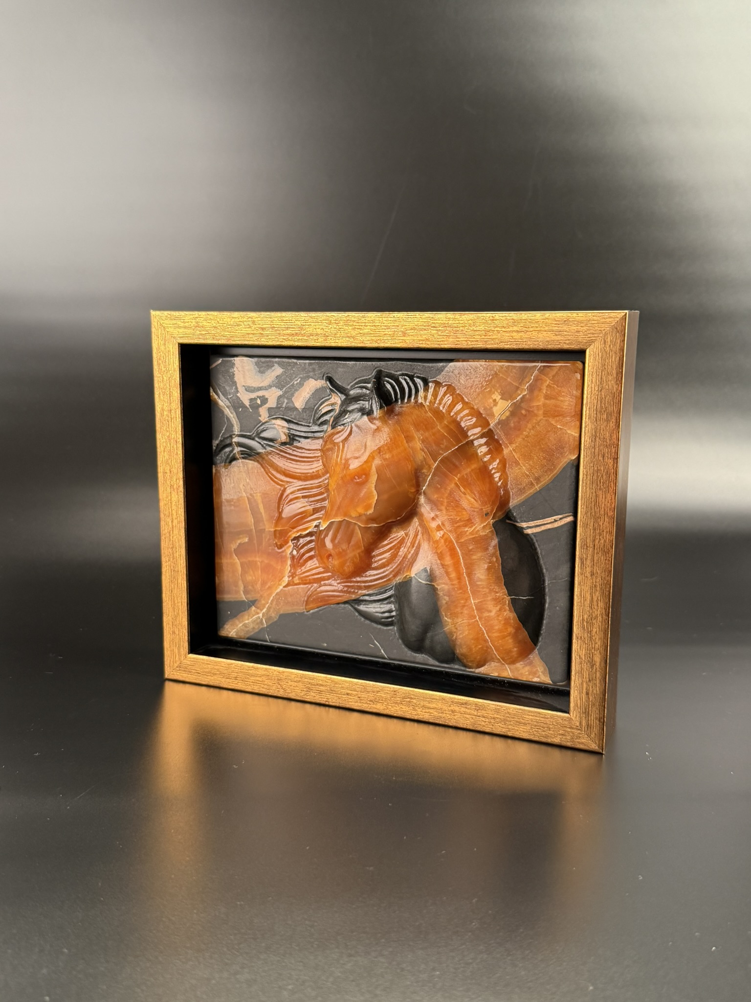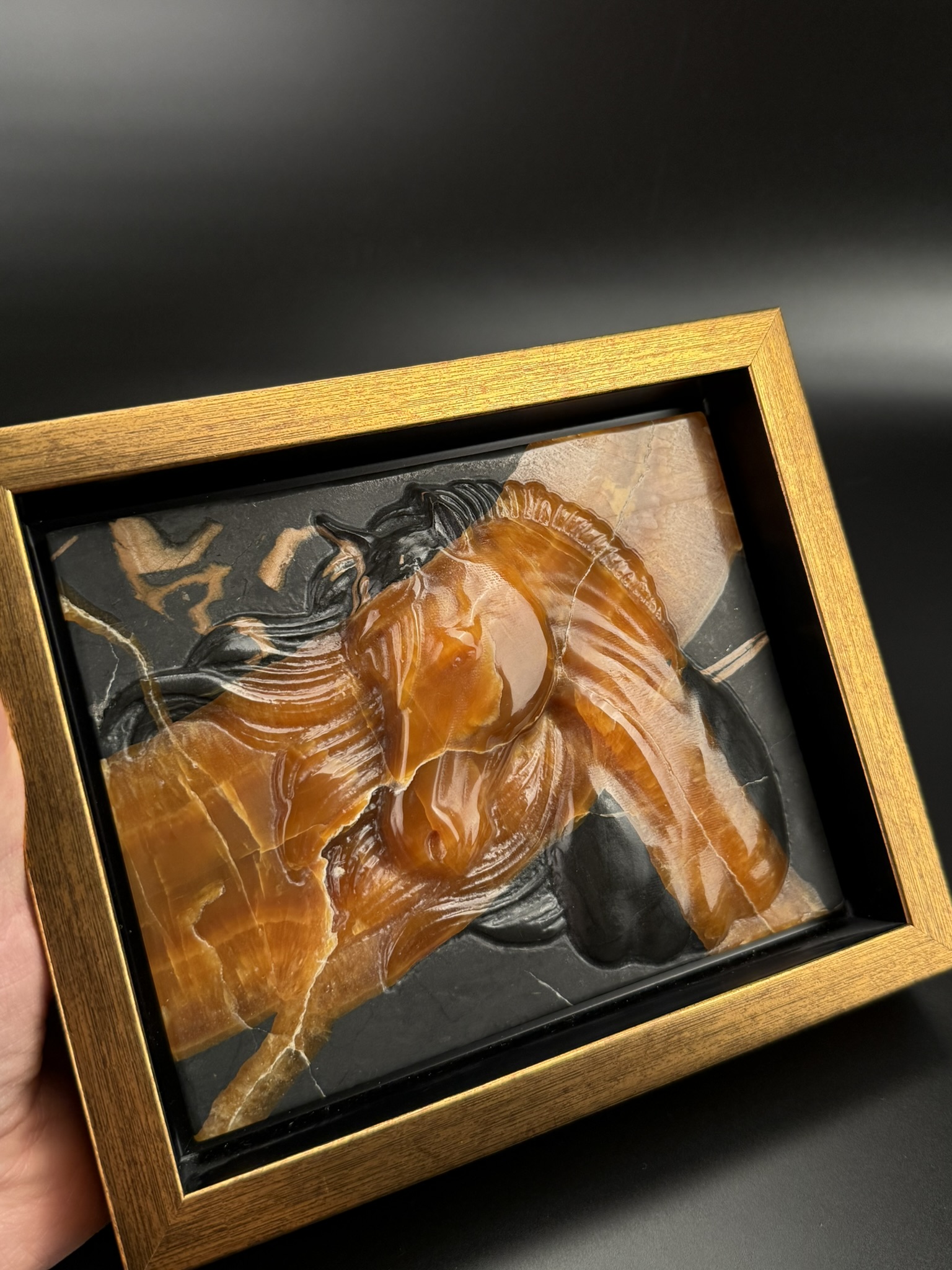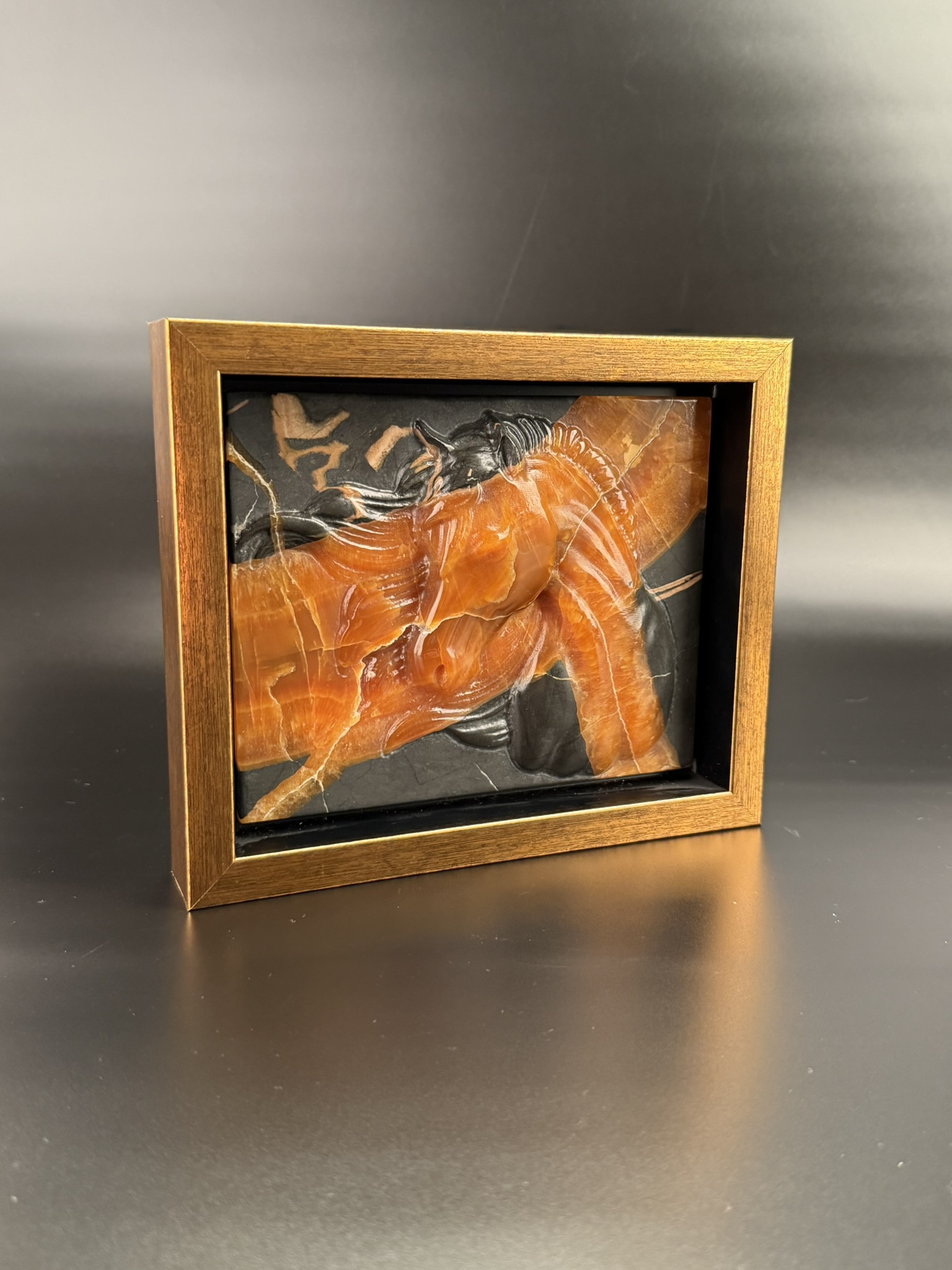 Резная картина с изображением лошади.