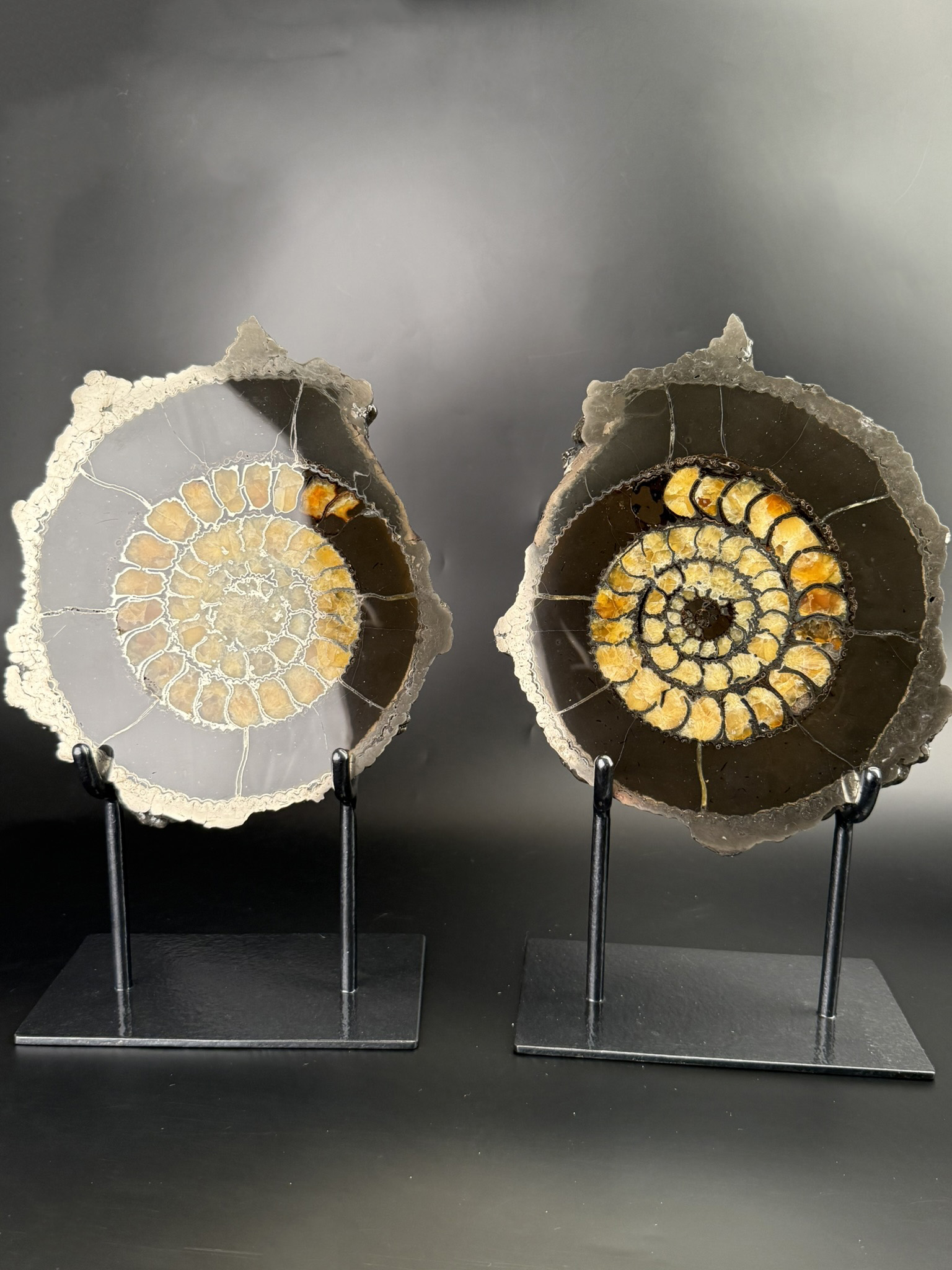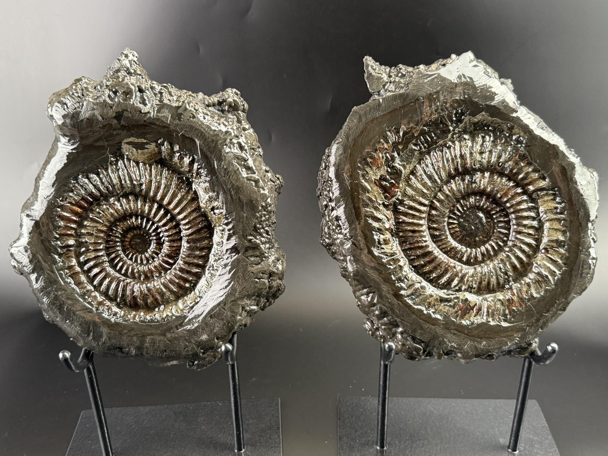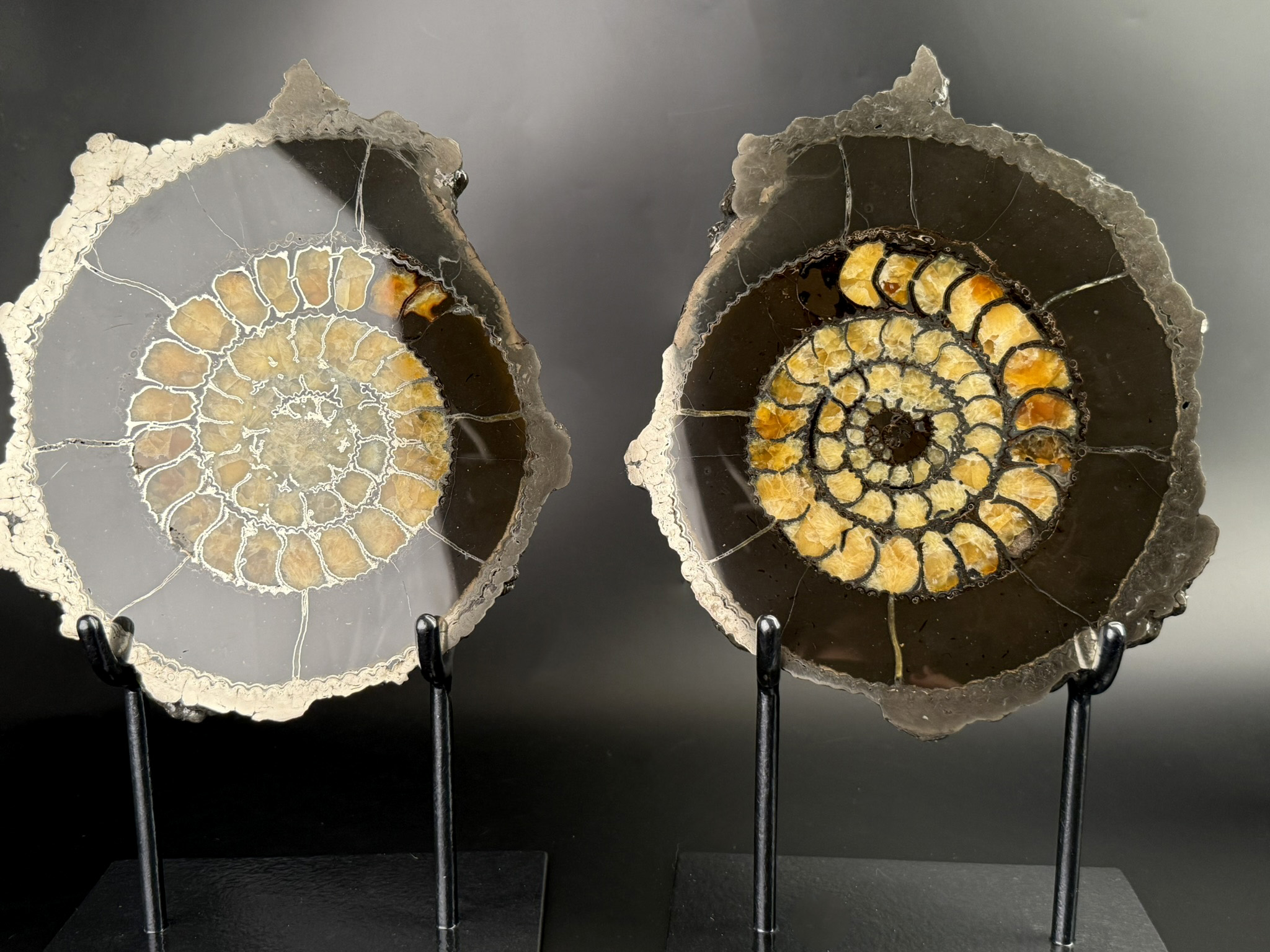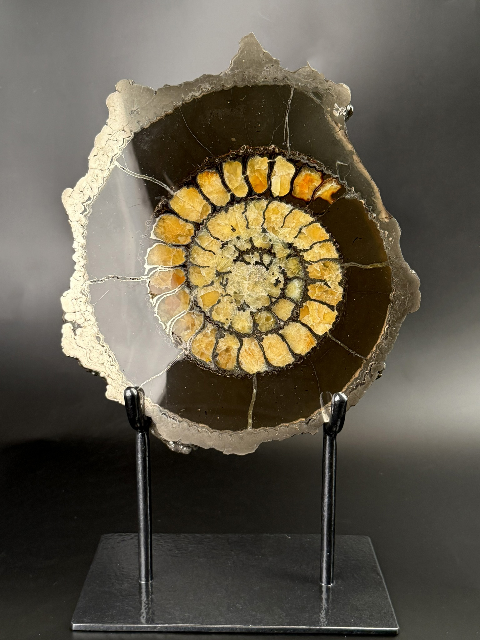 Данный способ обработки позволяет увидеть внутреннее строение раковины аммоноидей, а заполнение причудливое переплетение пиритовых стадий с кальцитовыми и кристаллическими щетками на стенках раковины.