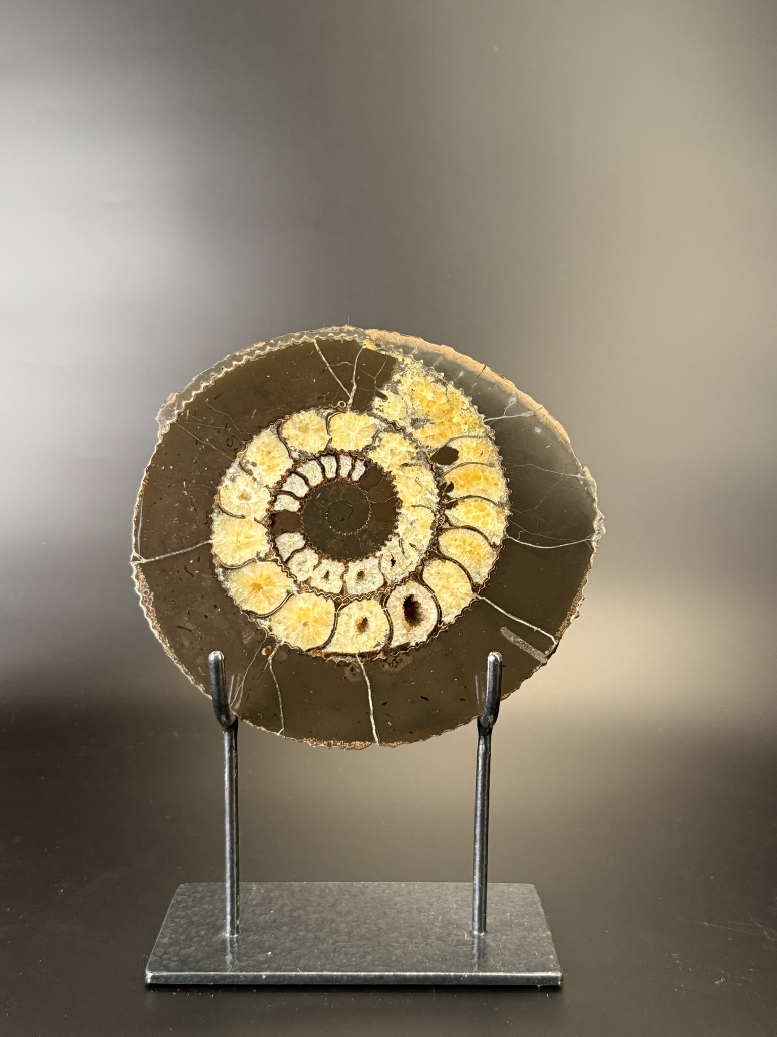 Распил аммонита спитоницерас. С уникальным кальцитовым заполнием. Найден на территории Ульяновской области. Возраст 130 мл. лет.